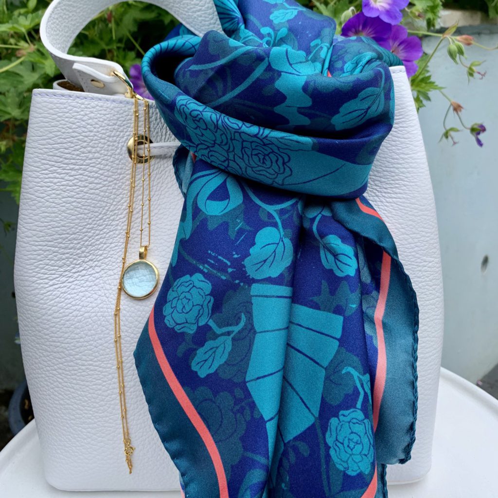 This scarf has a beautiful bold print of softly painted giant peonies in warm shades of red, orange, pink, yellow and turquoise. The background is a soft mix of creamy beige and light browns that is very flattering to most skin tones. The scarf is narrower than a typical pashmina, at 75cm and is in a fine wool and silk weave that will be cool enough to wear draped loosely in summer, but warm tied around your neck on colder days.